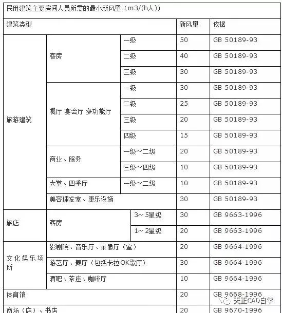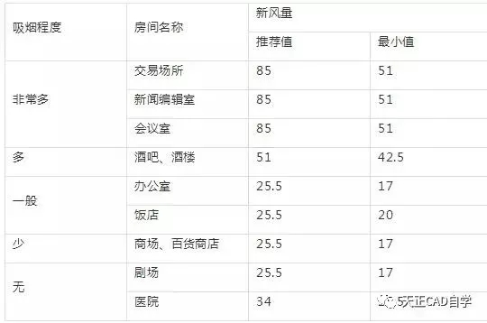 (2)人員所需新風量應滿足下表的要求,并根據人員的活動和工作性質以及在室內的停留時間等因素確定。