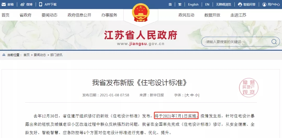 不久前,江蘇省新版《住宅設(shè)計標(biāo)準(zhǔn)》發(fā)布,從安全健康、全齡友好、智能智慧、應(yīng)急防控等4個方面對住宅設(shè)計標(biāo)準(zhǔn)進(jìn)行完善和提升,并于2021年7月1日正式實施!